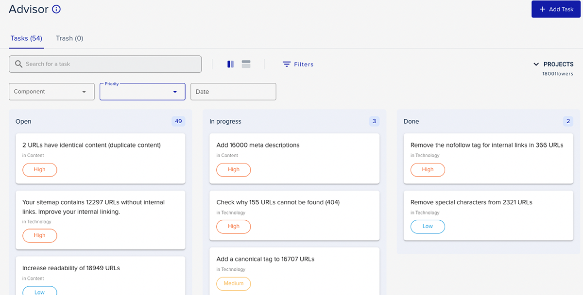 Lembre-se de que você precisa de um Project para que o recurso Advisor funcione. Além disso, a maioria das tarefas do consultor é adaptada ao site de um projeto (geralmente seu ou do seu cliente). Se você gerencia mais de um site, precisará criar um projeto extra para cada um deles.
